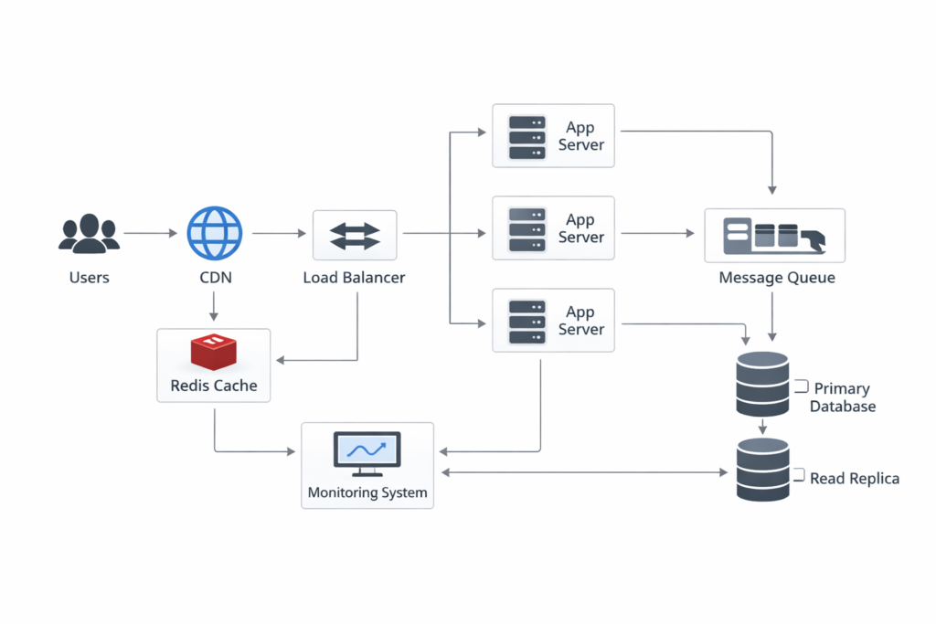 Finally, a Monitoring System (like Prometheus and Grafana) is essential. It tracks the health of all components, monitoring CPU usage, memory, request latency, and error rates. Without monitoring, you are flying blind; you won’t know the system has failed until the users start complaining.